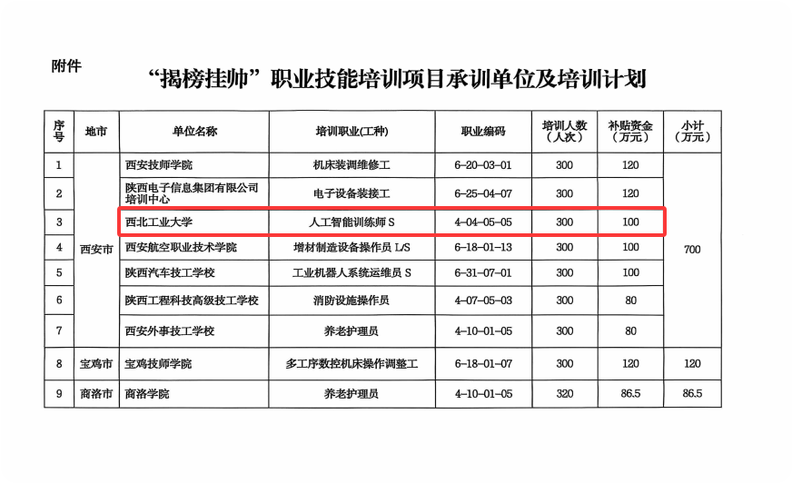 10月28日,“人工智能训练师(三级)职业技能培训”通过立项审批。根据《陕西省人力资源和社会保障厅关于开展“揭榜挂帅”职业技能培训项目有关工作的通知》,西北工业大学继续教育学院为人工智能训练师承训单位。培训人数共300人,50人为一个班次,共6期班次。培训学时:140学时/期。学习方式:理论部分(56学时)线上或线下培训,实操课部分(84学时)线下培训。