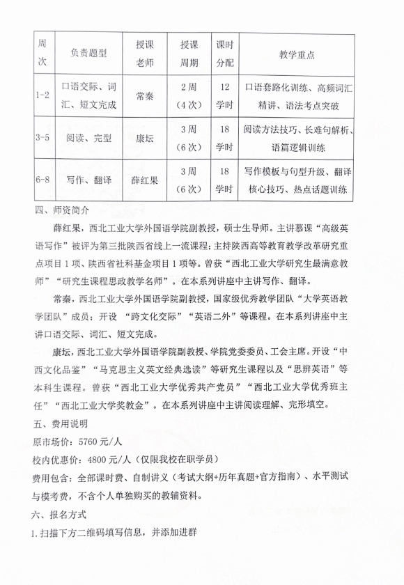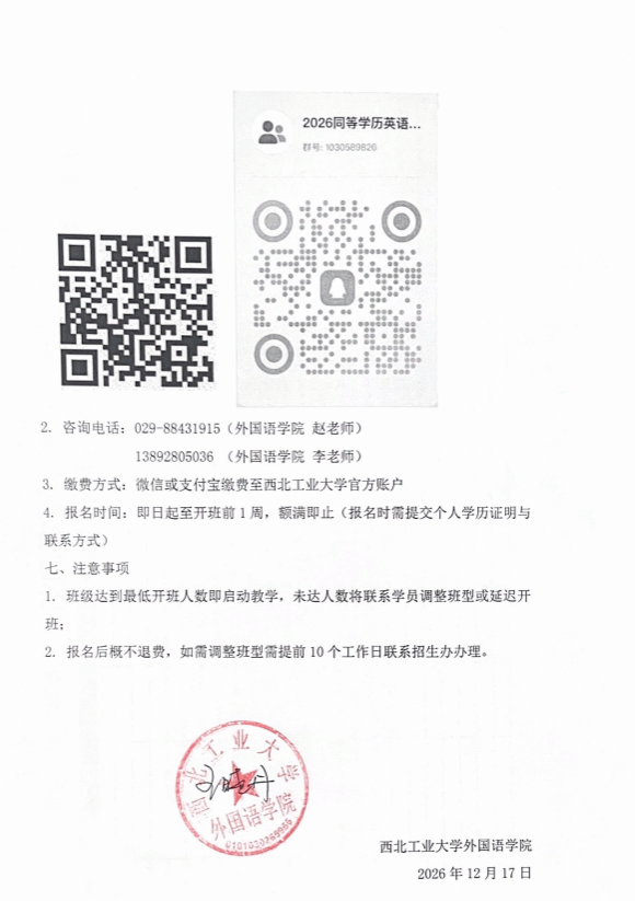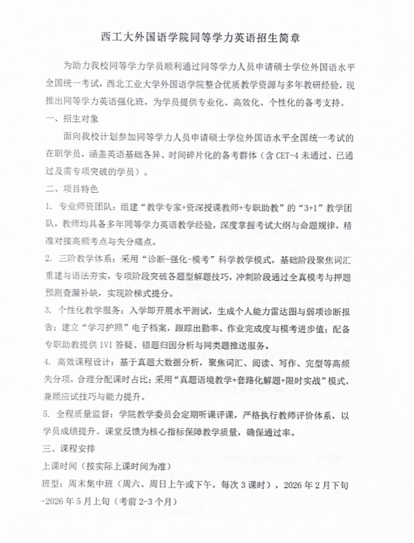 12月24日,“西工大外国语学院同等学力英语强化班”通过立项审批,该项目为西北工业大学外国语学院举办。培训人数预计25-50人/班,每学期1-2个班,培训课时为48课时/班。授课安排以招生简章为准。
