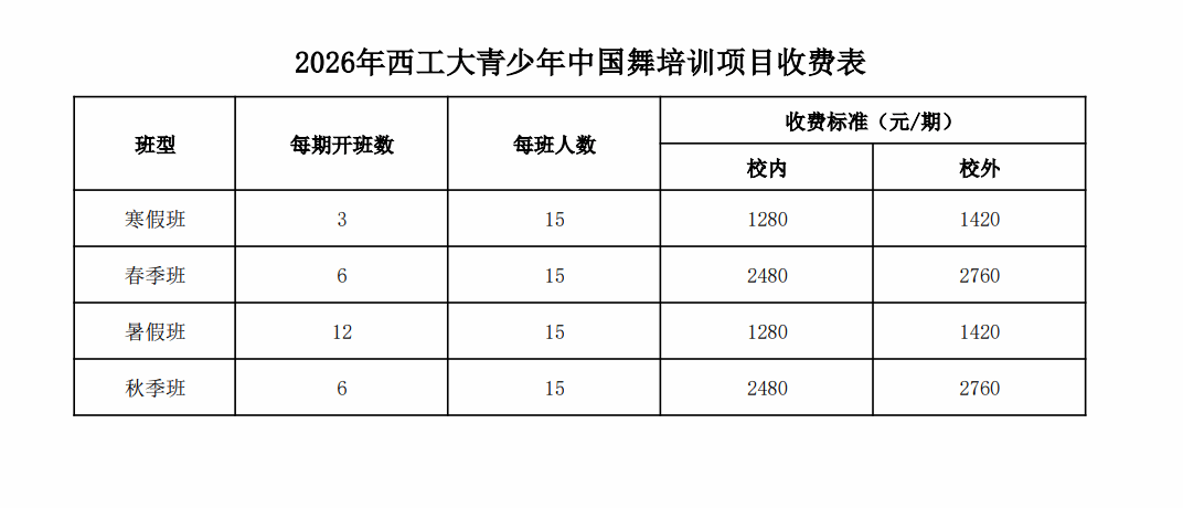 1月7日,“2026年西工大青少年中国舞培训”通过立项审批,该项目为继续教育学院举办。课程设置涵盖春秋季班与寒暑假班两大班次。培训课时及课程安排等以招生简章为准。
