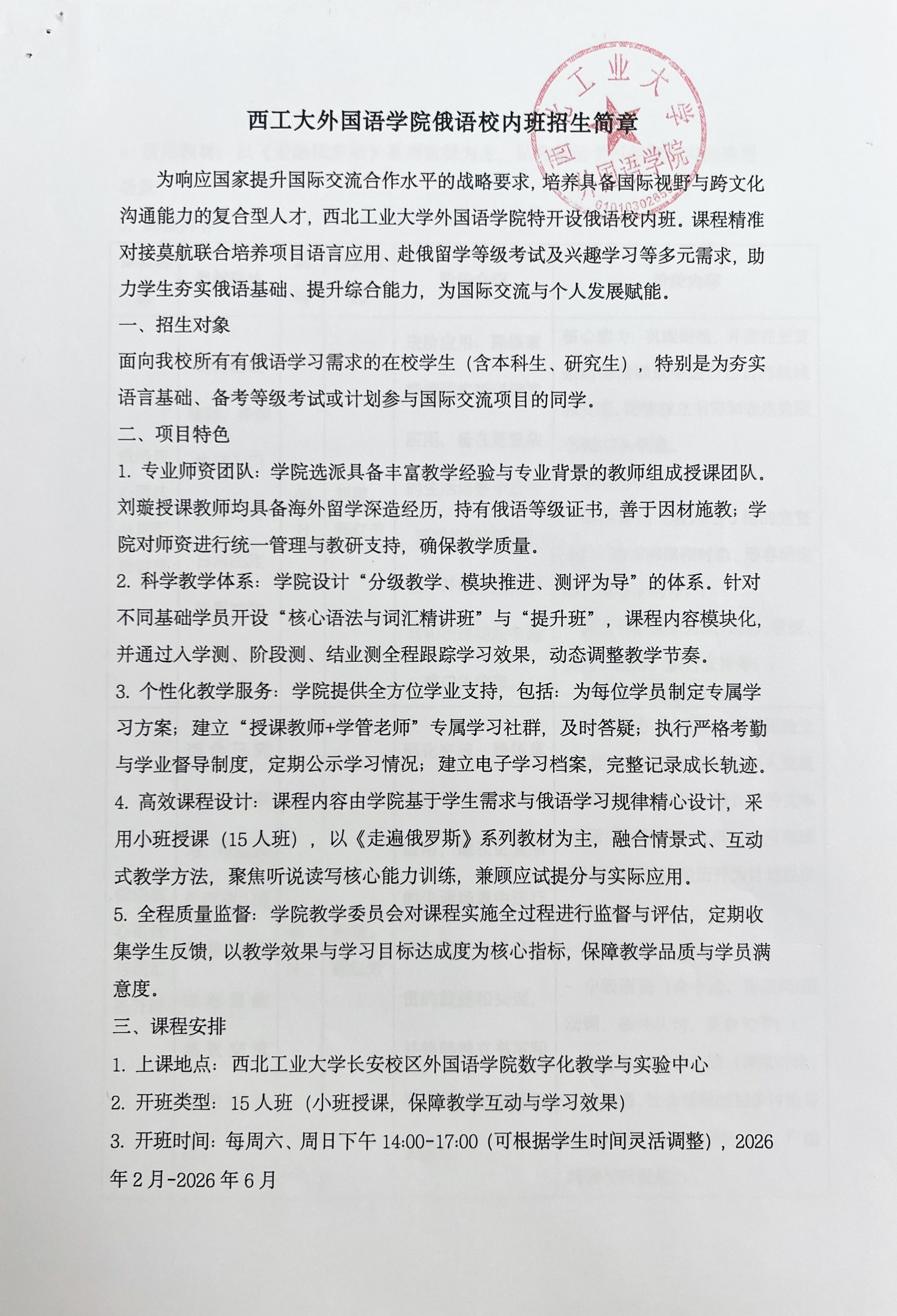 1月15日,“西工大外国语学院俄语校内班”通过立项审批,该项目为西北工业大学外国语学院举办。培训人数预计8-15人/班,每学期2-3个班,培训课时为48课时/班。授课安排以招生简章为准。